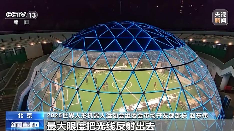 2025世界人形机器人运动会组委会市场开发部部长 赵东伟:屋顶的这个反光膜,我们也是采用了三层。最外层是反光膜,最大限度把光线反射出去,能够保证穹顶内部的结构温度是适宜的。第二层是一个保温层,第三层是一个吸音层。有这三层的结构,我们就能最大限度保证,这个环境是适合进行比赛的,没有任何的噪声,同时又能够尽可能地去控制穹顶内部结构的温度和湿度。
